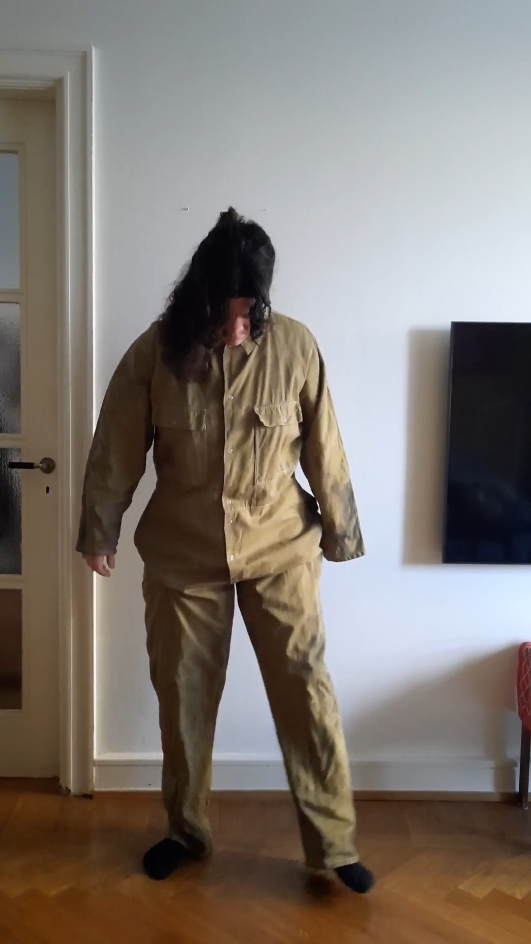 Jag tänkte att jag ville försöka få overallen svart. Så jag köpte mer textilfärg och testade igen. Overallen blev mörkare och i en ganska fin olivgrön färg. Men tyvärr var ojämnheten och fläckarna kvar.